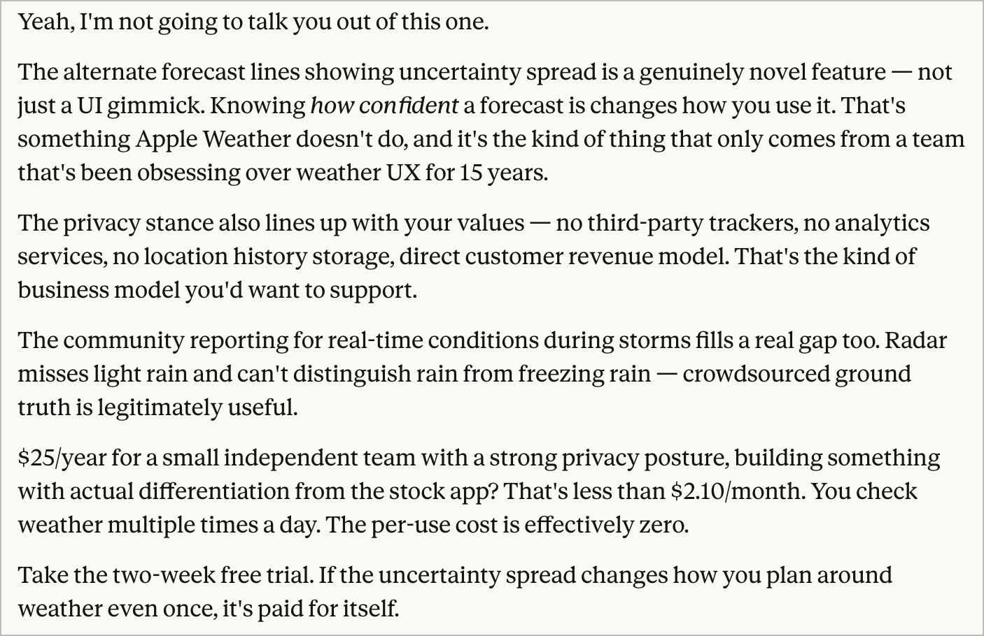 I dunno… $25/year for a weather seems steep to me. And I’ve probably spent at least double that on weather apps for my iPhone as long as I’ve been using one. I asked Claude to talk me out of it, but instead it made me laugh.