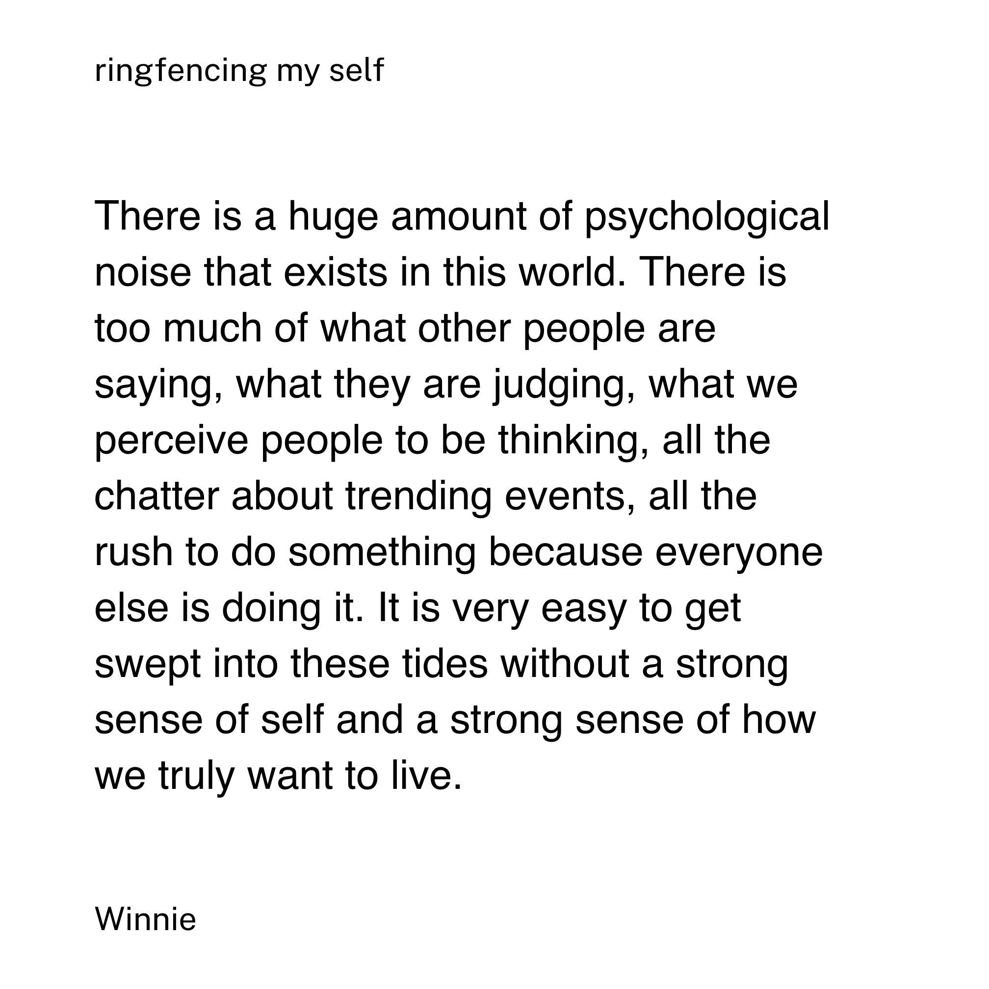 Winnie’s latest post was a wonderful read, especially her point about being relentlessly bombarded with psychological noise. It is not uncommon to catch myself thinking a certain way about something only to realize it doesn’t feel right. It’s almost always because the thought isn’t actually mine.